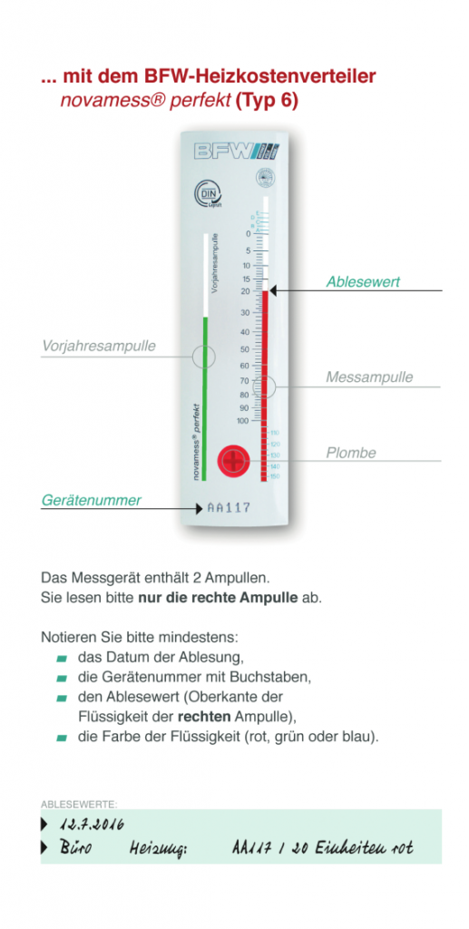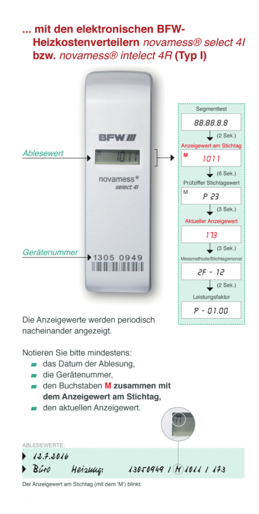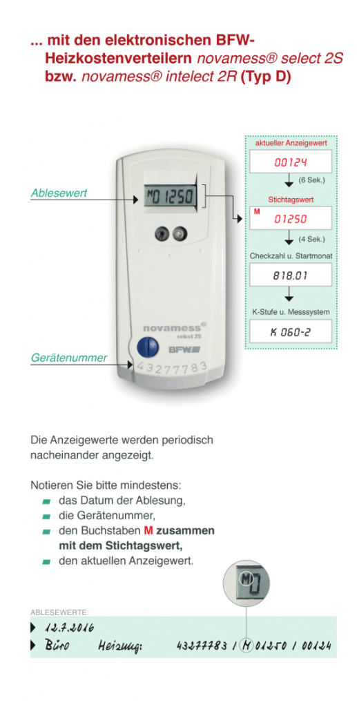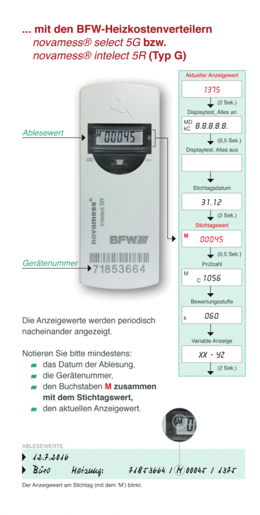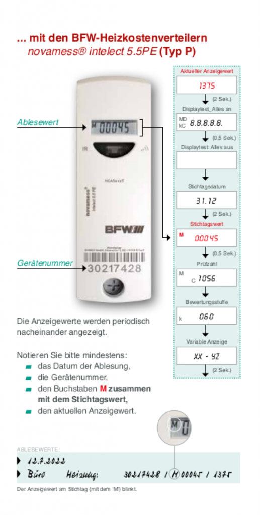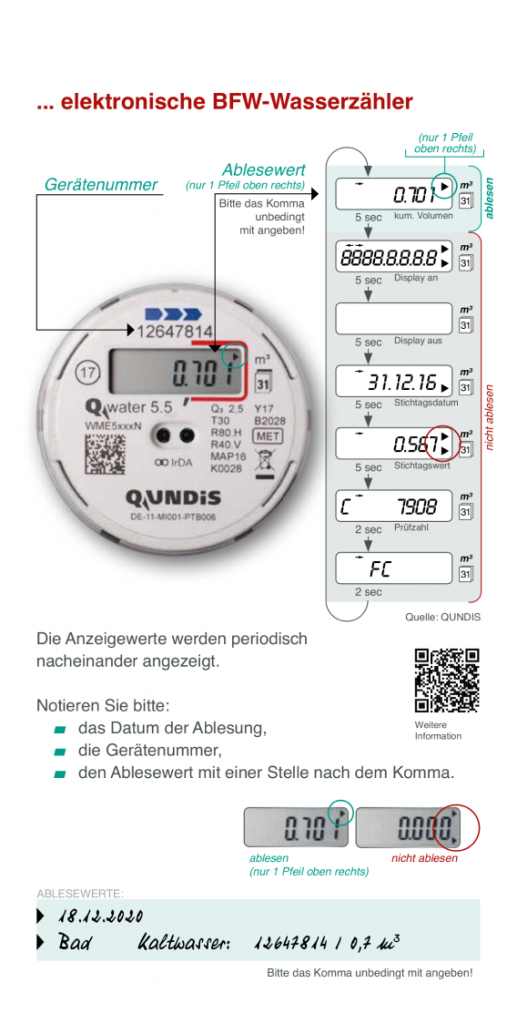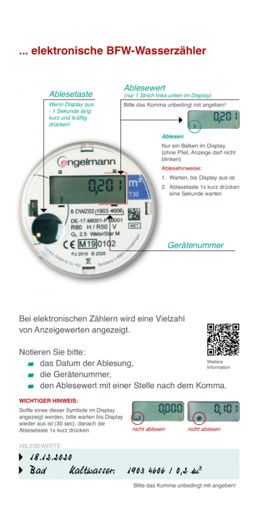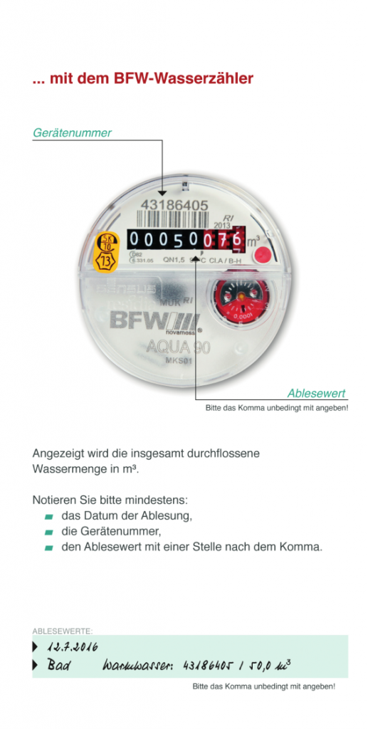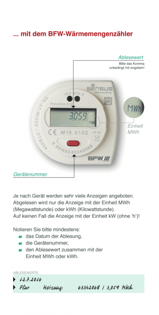 Die BFW Werner Völk GmbH setzt eine Reihe unterschiedlicher Messgeräte zur Erfassung des Verbrauchs von Wasser und Wärmemenge ein. Elektronische Zähler können zudem eine Vielzahl von Anzeigewerten anzeigen. Nur bei genauer Kenntnis der relevanten Werte ist es uns möglich die Verbrauchskosten exakt abzurechnen. Um Ihnen das Ablesen unserer Geräte zu erleichtern, finden Sie nachfolgend Informationsmaterial mit Beispielen und wichtigen Hinweisen. Eine Erläuterung zur Spalte KENNUNG auf dem Ableseprotokoll finden Sie weiter unten.